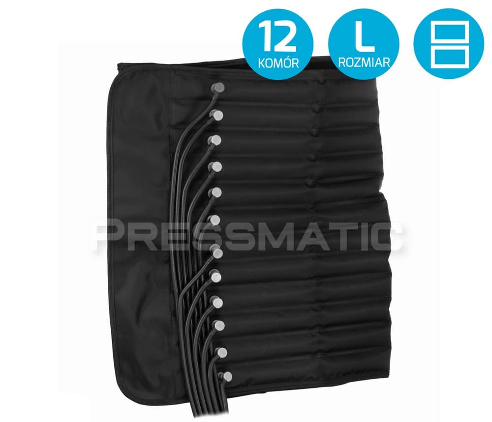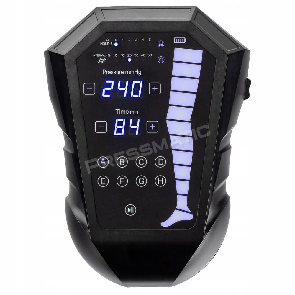 Pressmatic PM-12000M, to wysokiej klasy aparat do presoterapii z zasilaniem akumulatorowym, przeznaczony do obsługi 12-KOMOROWYCH mankietów uciskowych.