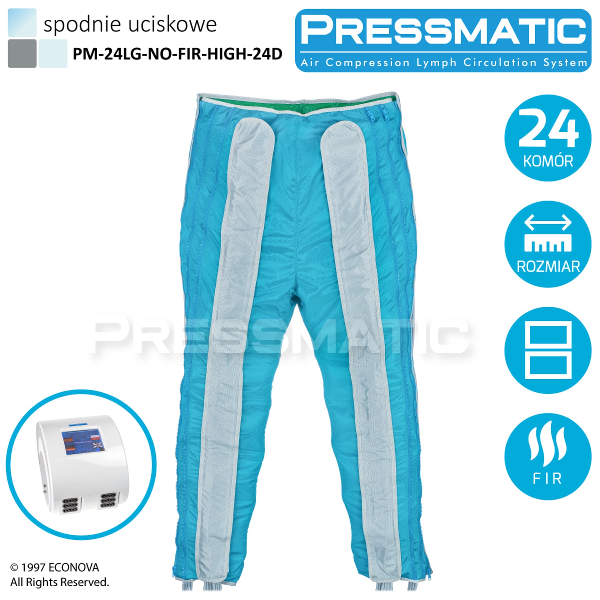 Pressmatic PM-24000D, to wysokiej klasy aparat do presoterapii z możliwością obsługi 24 komór jednocześnie. Polecany jest dla profesjonalnych placówek fizjoterapii i kosmetologii.