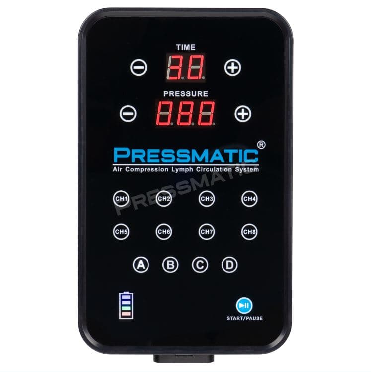 Pressmatic PM-8000M, to wysokiej klasy aparat do presoterapii z zasilaniem akumulatorowym, przeznaczony do obsługi 8-KOMOROWYCH mankietów uciskowych.